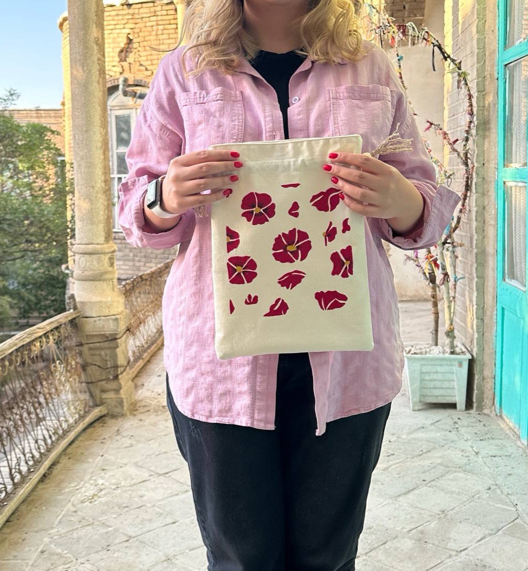 جنس کرباس ضخیم و محکم دارای آسترسایز : ۲۴ در ۳۲قابل شستشو و کاربردیرنگ ثابتنقاشی با قلم مو و رنگ مخصوص پارچهبند کنفی و مهره چوبی