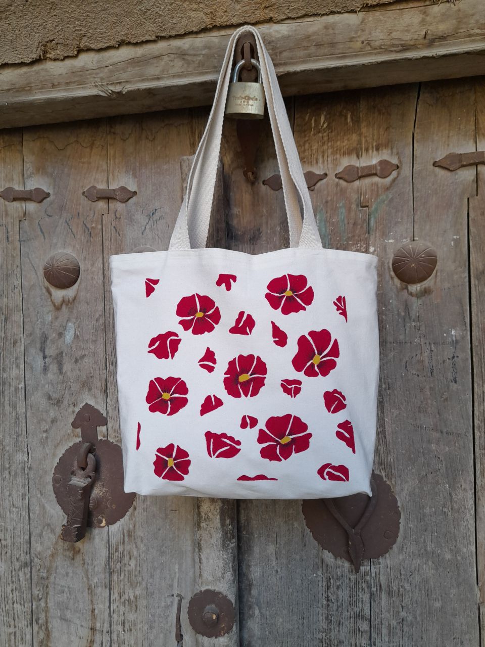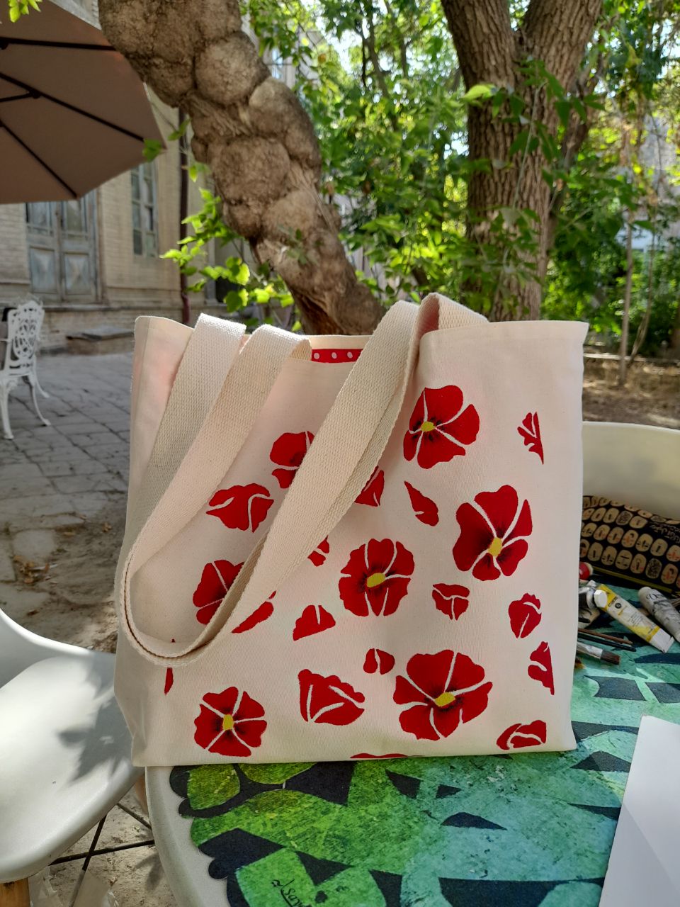 جنس کرباس ضخیم و محکم دارای کفیسایز ۴۰ در ۴۴نقاشی با قلم مو و رنگ مخصوص پارچهقابل شستشو و رنگ ثابتاستفاده از رنگ پارچه برند : یکتا آرتآستر نخی رنگی و بند محکم ۷۵ سانت